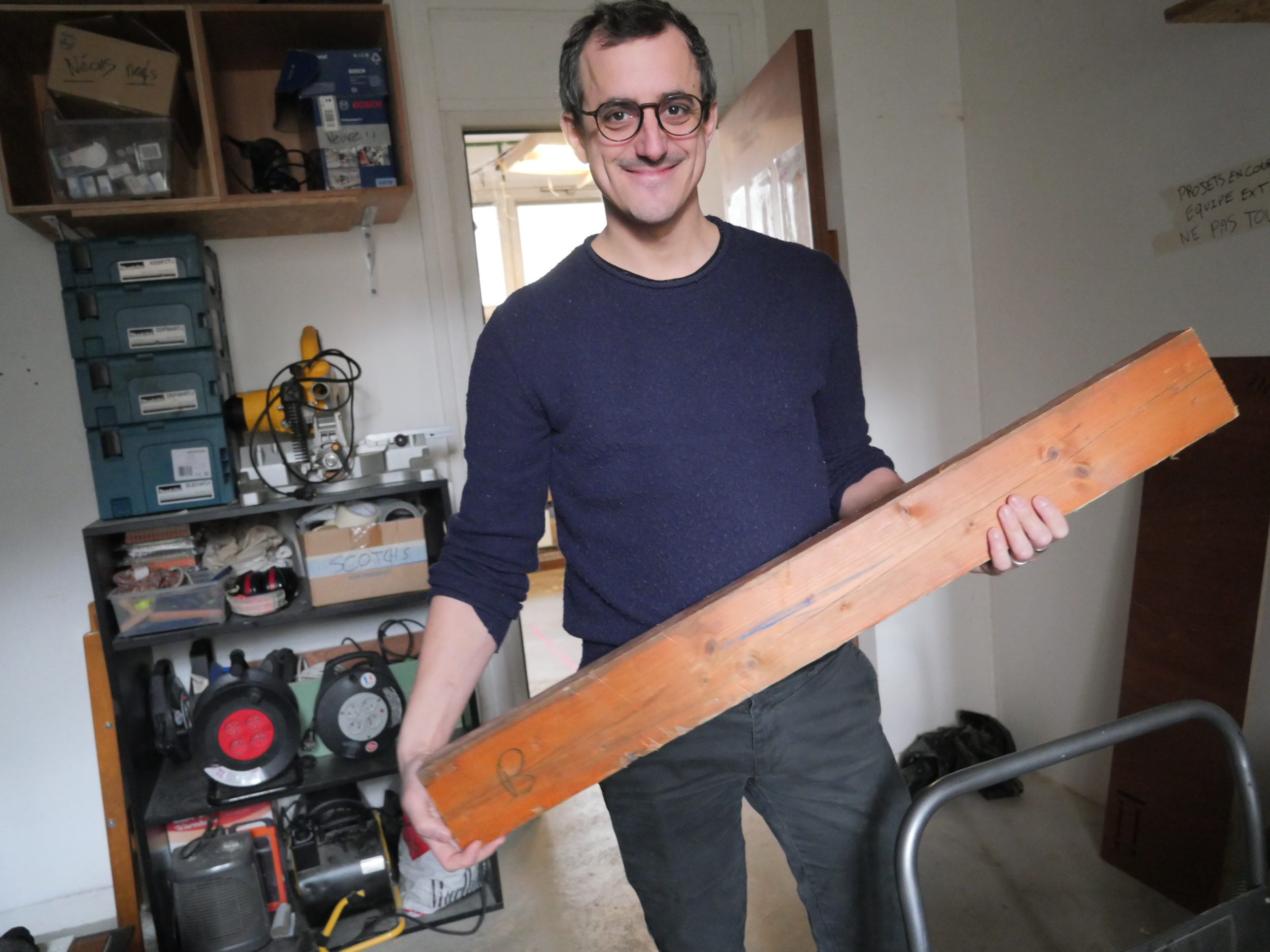 Dans la menuiserie sociale et solidaire Extramuros du XXe arrondissement de Paris, au milieu des établis, le niveau sonore de la dégauchisseuse et de la raboteuse remplit tout l’espace. Autour, plusieurs jeunes équipés de casques s’affairent méthodiquement. Dans une pièce en retrait, Antoine Havard, directeur de l’association, montre une pièce horizontale en bois de mélèze.