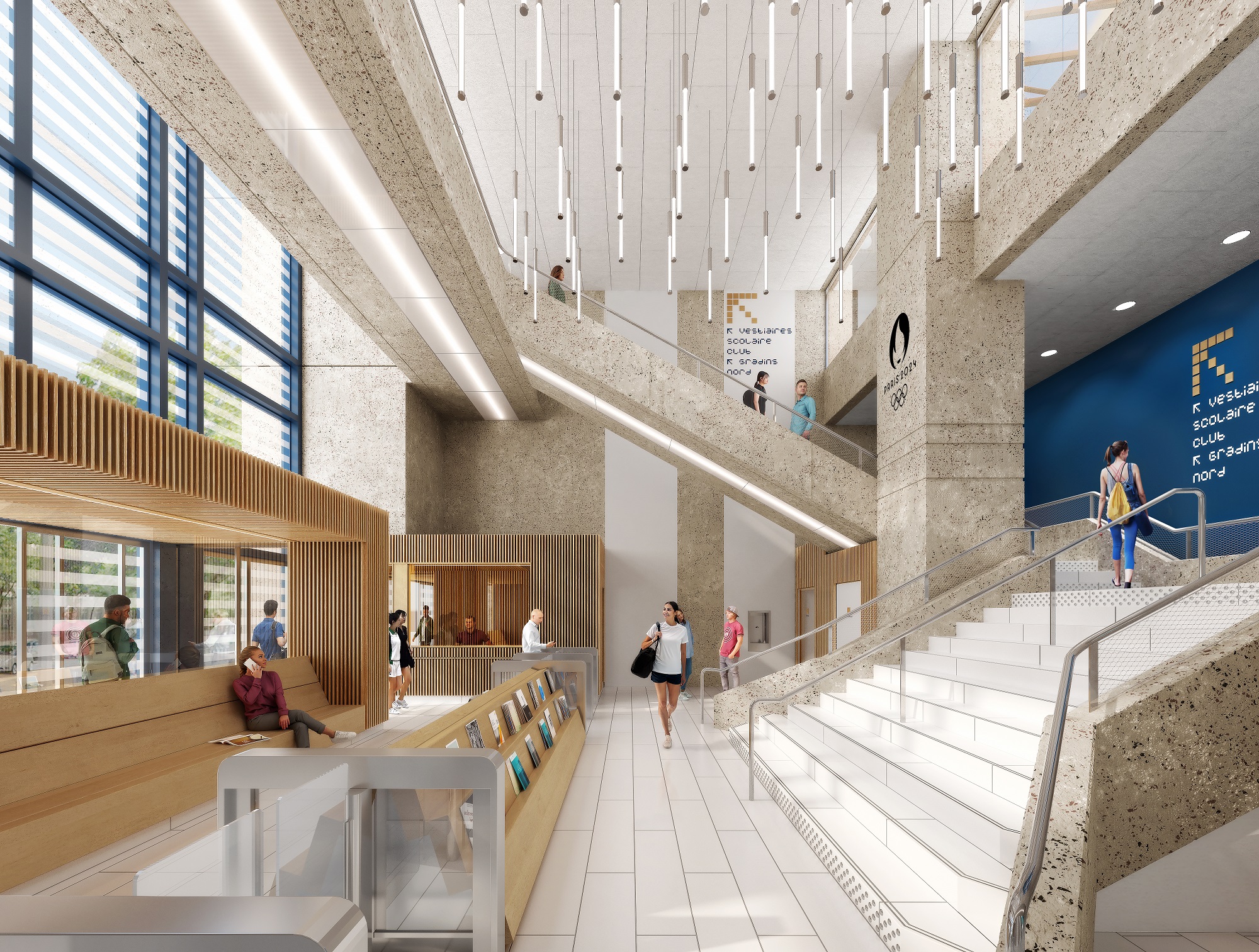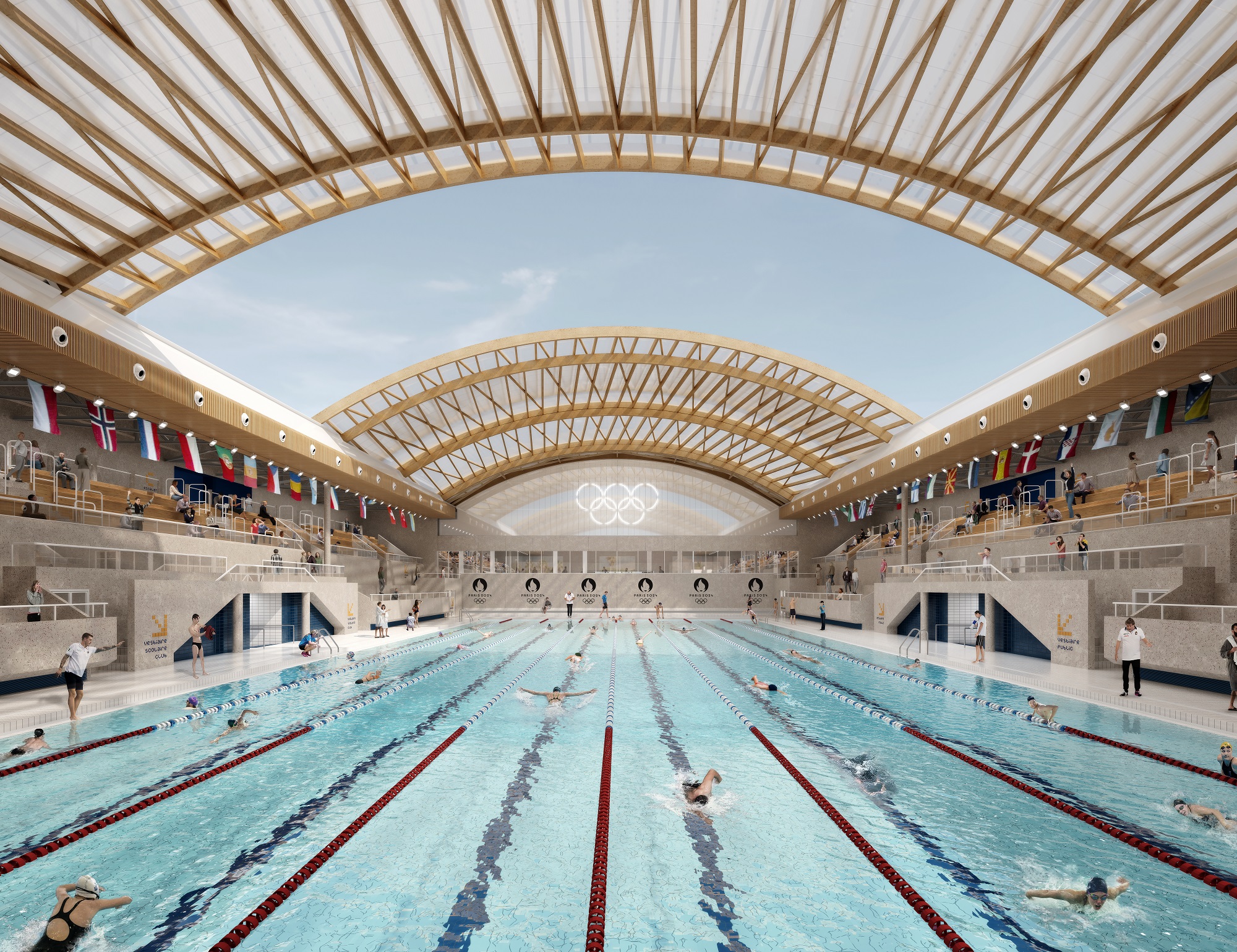 La charpente en bois de la piscine olympique se transforme en mobilier