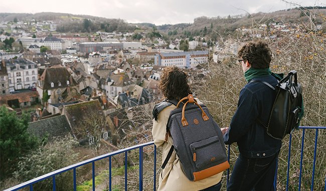 Maïann Desgranges (à gauche), étudiant à Sciences Po Bordeaux, et Antoine Chavant, étudiant en droit, devant la ville d’Aubusson © Pauline Gauer