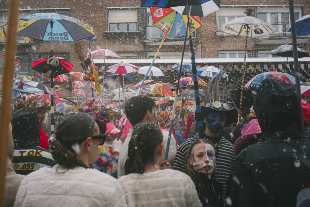 Son appareil photo en bandoulière, Odhrán Dunne s’est immergé dans un immense rassemblement, celui du Carnaval de Dunkerque. Cette année, même la neige n’a pas eu raison des carnavaleux, arborant leur plus beau Clet’che (déguisement). Un moment suspendu où les frontières entre les genres, les âges et les milieux sociaux se troublent.
